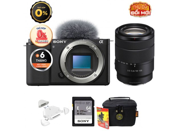 Sony ZV-E10 (Chính hãng) (Kèm Lens Sony E 18-135mm f/3.5-5.6, Black, Đầu Đọc Thẻ + Thẻ Nhớ 64GB + Túi Máy Ảnh)