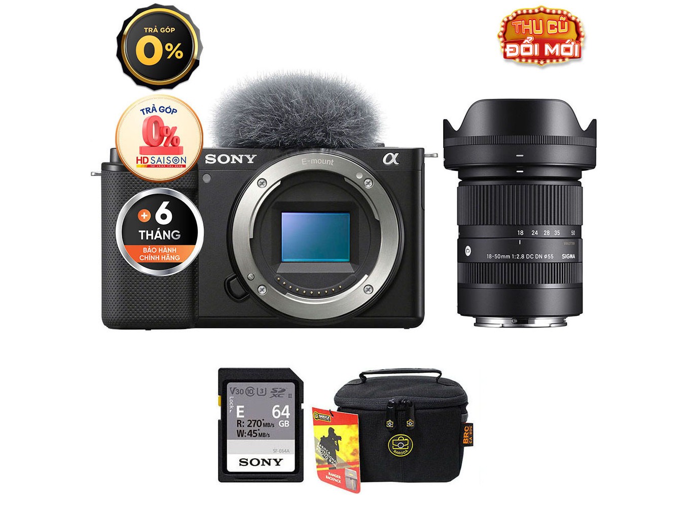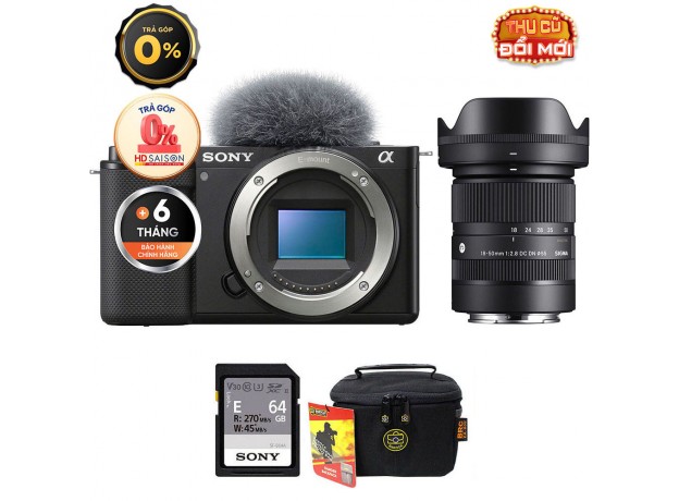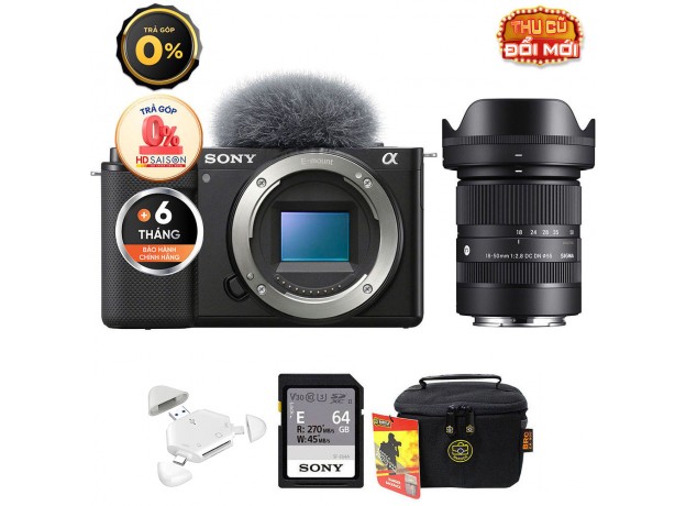 Sony ZV-E10 (Chính hãng) (Kèm Lens Sigma 18-50mm f/2.8, Black, Đầu Đọc Thẻ + Thẻ Nhớ 64GB + Túi Máy Ảnh)