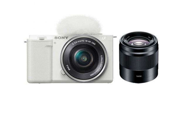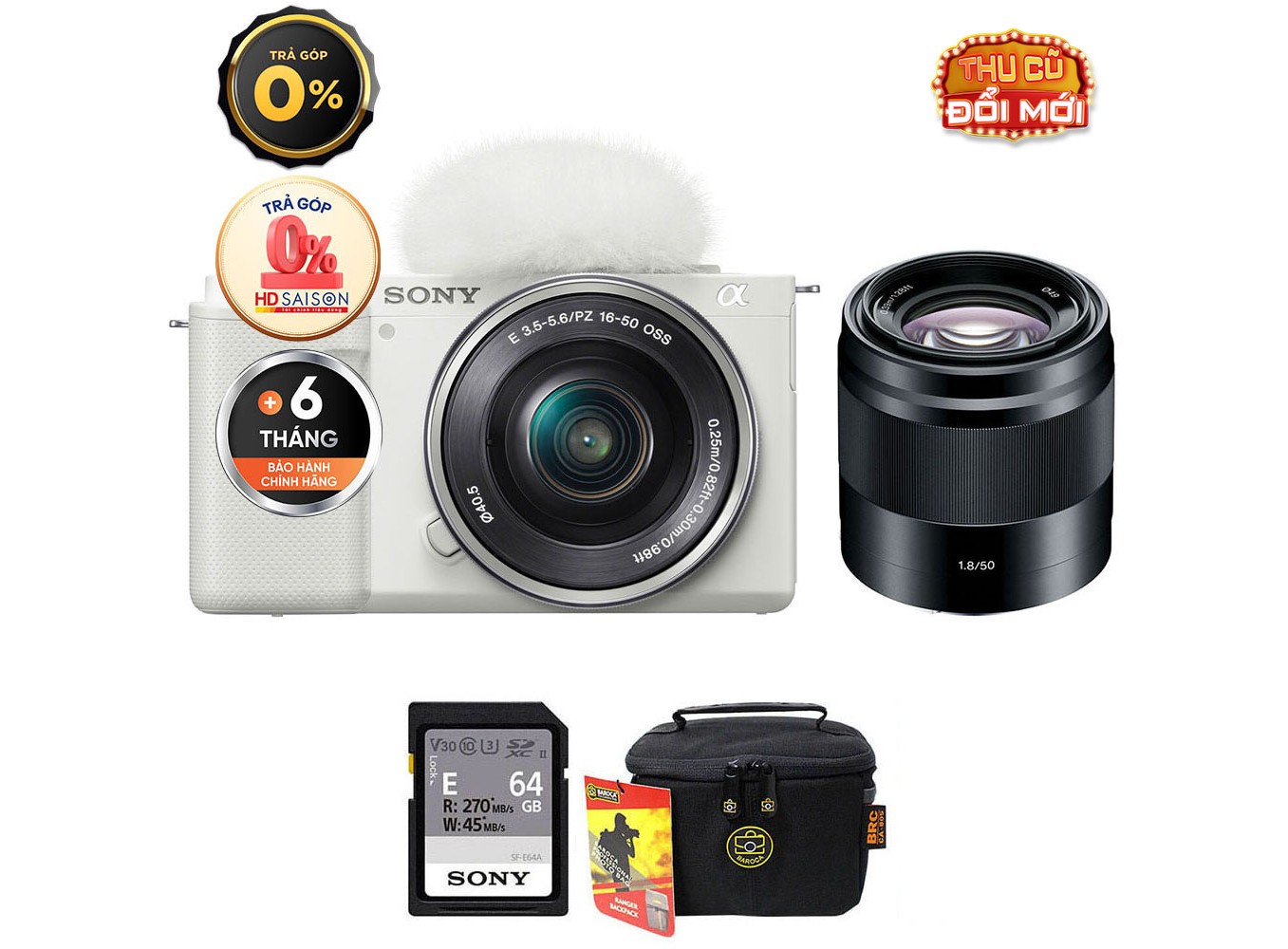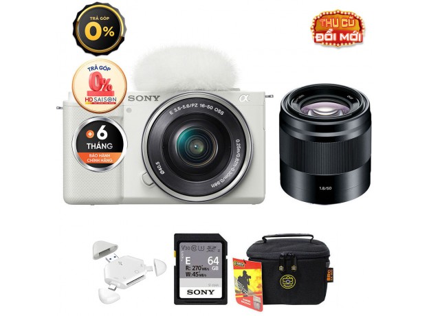 Sony ZV-E10 (Chính hãng) (Kèm Kit Lens 16-50mm + Sony E 50mm f/1.8 OSS, White, Đầu Đọc Thẻ + Thẻ Nhớ 64GB + Túi Máy Ảnh)