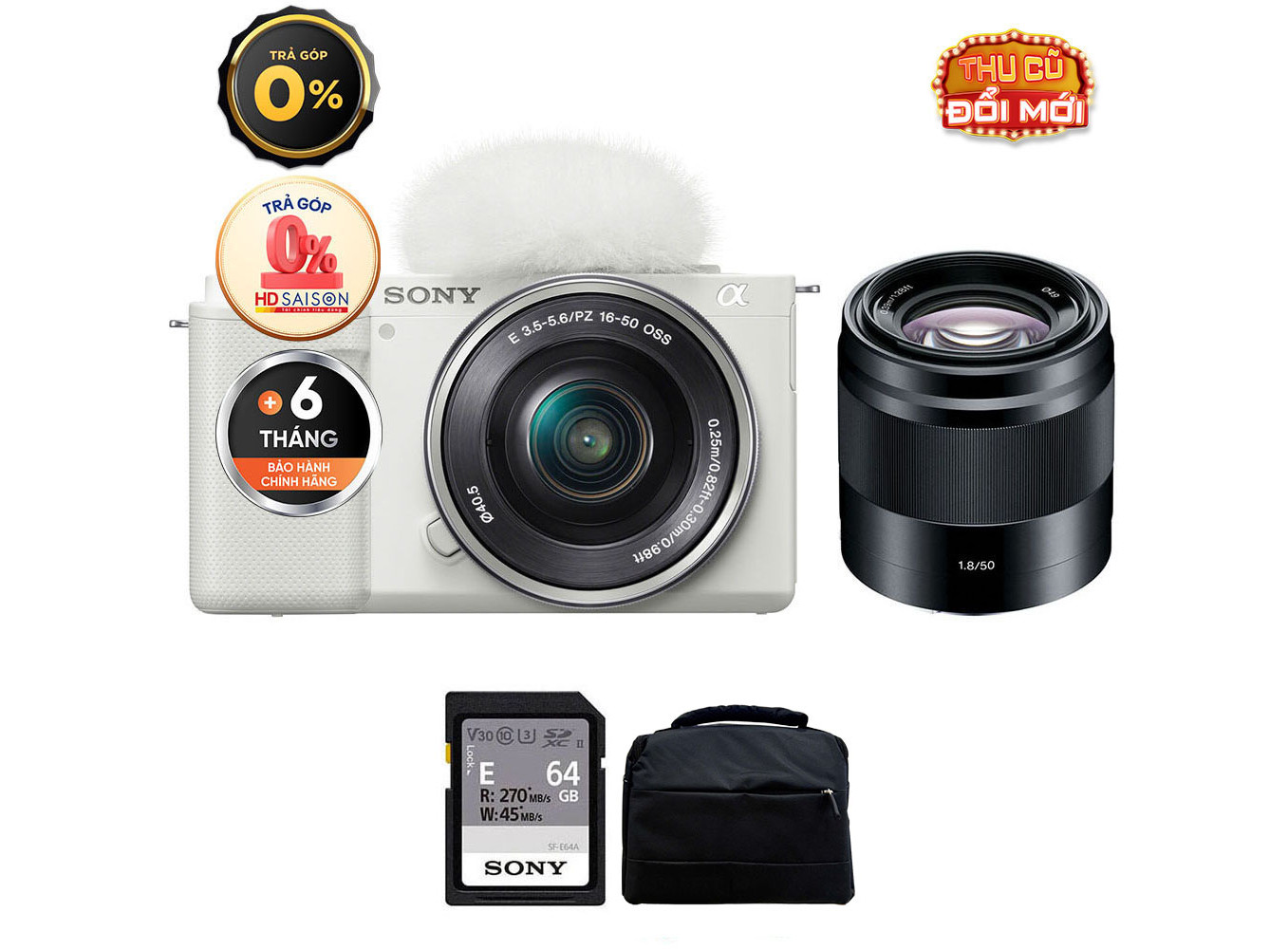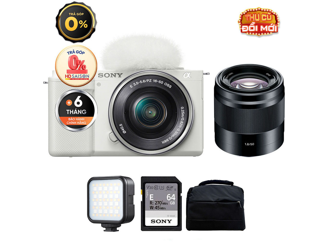 Sony ZV-E10 (Chính hãng) (Kèm Kit Lens 16-50mm + Sony E 50mm f/1.8 OSS, White, Thẻ Nhớ 64GB + Túi Máy Ảnh + Đèn LED)