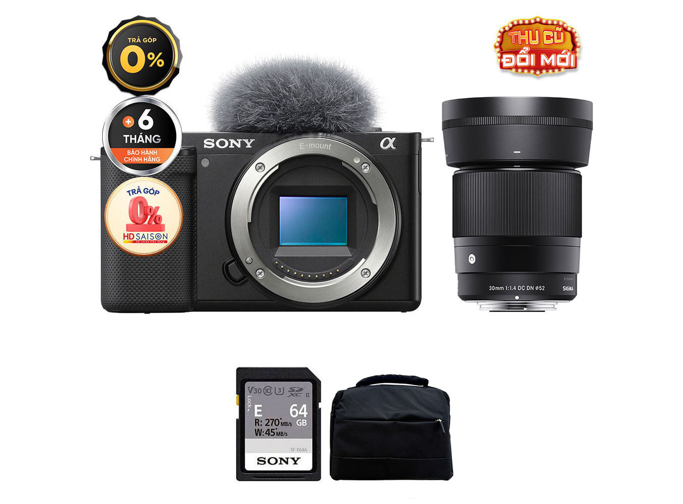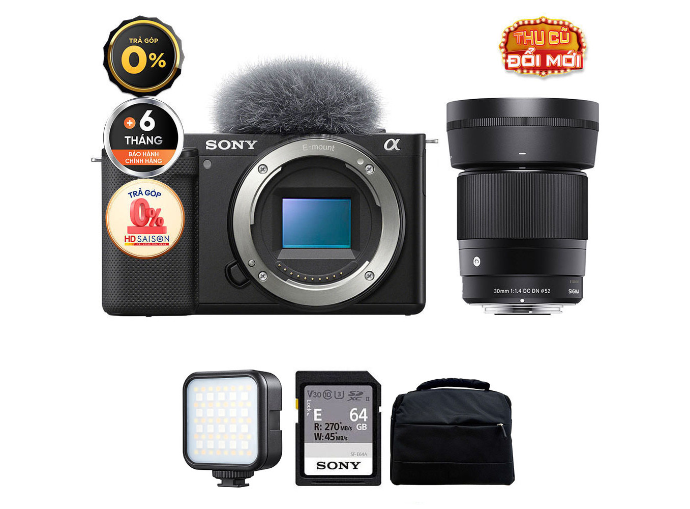 Sony ZV-E10 (Chính hãng) (Kèm Lens Sigma 30mm f/1.4, Black, Thẻ Nhớ 64GB + Túi Máy Ảnh + Đèn LED)