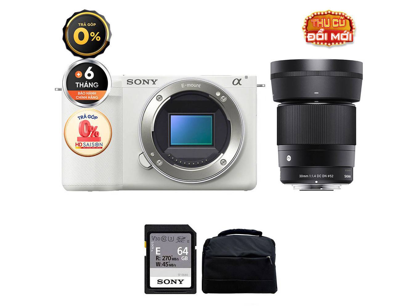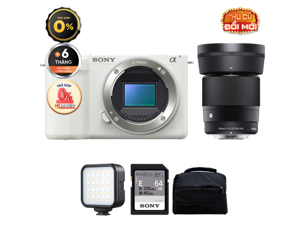 Sony ZV-E10 (Chính hãng) (Kèm Lens Sigma 30mm f/1.4, White, Thẻ Nhớ 64GB + Túi Máy Ảnh + Đèn LED)