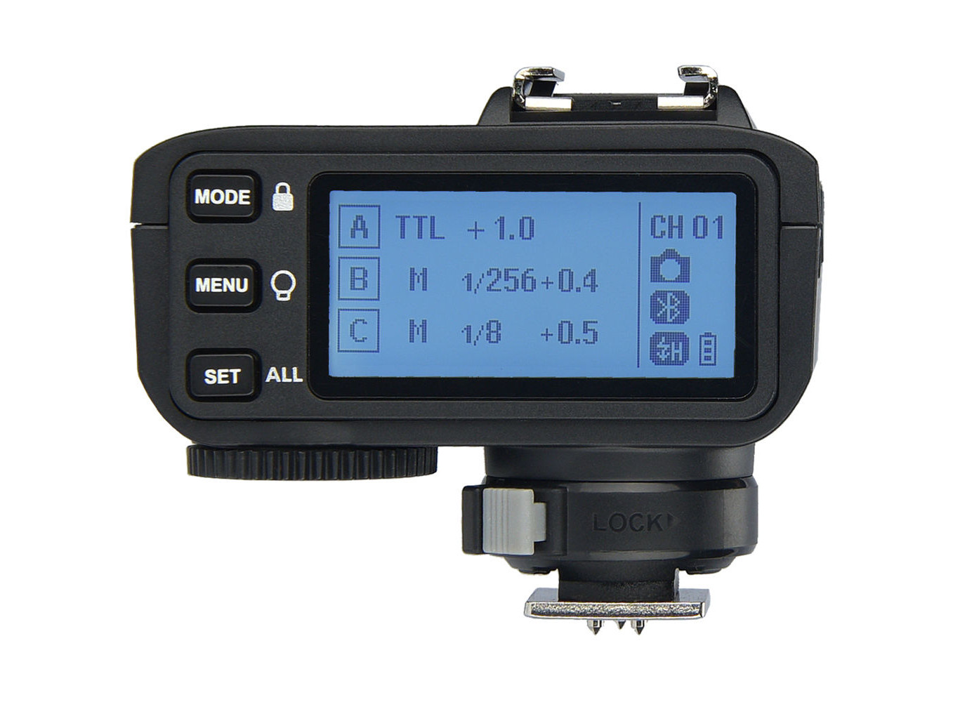- Mọi thiết lập đều xem được dễ dàng trên màn hình LCD lớn trên trigger, có thể chiếu sáng ngược bên cạnh các nhóm và nút chức năng.