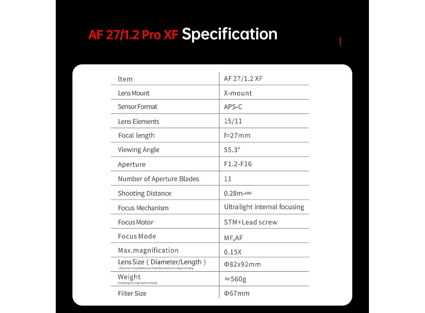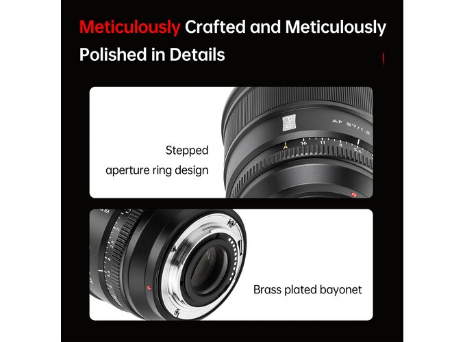 Viltrox AF 27mm f/1.2 PRO XF dành cho máy ảnh mirrorless Fujifilm X, là ống kính một tiêu cự nhanh, chụp chân dung, có hiệu suất lấy nét tự động tiên tiến, thiết kế quang học tinh xảo cùng với khả năng xử lý và độ tin cậy chuyên nghiệp. Với khẩu độ tối đa lớn và độ sâu trường ảnh nông, ống kính này mang lại hiệu suất ánh sáng yếu tuyệt vời và chất lượng hình ảnh cực kỳ sắc nét. Động cơ bước STM được thiết kế mới mang lại hiệu suất lấy nét tự động nhanh và chính xác, đồng thời công tắc MF/AF dễ tiếp cận cho phép bạn nhanh chóng chuyển đổi qua lại giữa chế độ lấy nét thủ công và tự động.